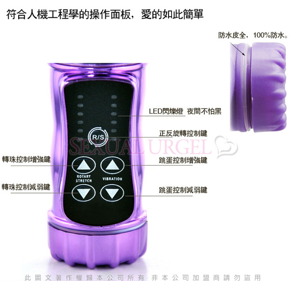 6種轉速,6段震頻,正反旋轉,帶來不同的高潮體驗!特製的人性化控制器,方便實用!棒身360度正反旋轉,與身體配合更完美!生活防水設計,讓快樂無拘無束!