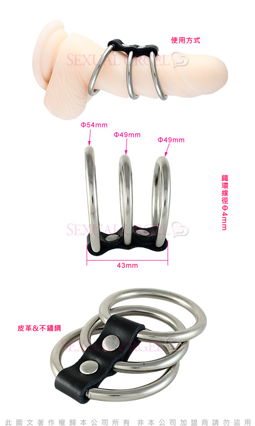 本品由不銹鋼與皮革製作,由一大兩小三隻陽具環組成,並以皮革扣帶相連,大環直徑5.4cm,兩隻小環直徑4.9cm。使用時可將三隻陽具環依次套在勃起的陽具上,增加男性性感與功能。