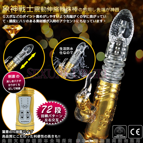 最新強力電動伸縮按摩棒,可同時震動陰道、陰核,震動力強勁!耐用、耐操,同時可震動,遠遠超越了男性陽具所能發揮的體能極限,強烈的戳幹力,幾乎讓人無法一手掌握,再怎麼強烈的燎原慾火,也會被它所撲滅夷平。中間的環紋部分不停地伸縮、抽動,在您的私處進出、摩擦;小象長長的鼻子拍打、添吸著您最敏感的陰蒂……