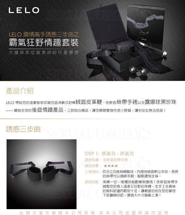 用LELO這一最性感魅惑的情趣套裝大膽探索您最美妙的性愛夢想。這一套裝包含柔軟流蘇式舒樺絨面皮革鞭與依斯若絲帶手銬,與露娜球TM黑色——LELO最暢銷的縮陰球一起,給前戲增添全新維度,讓您體驗如夢似幻的性愛激情。