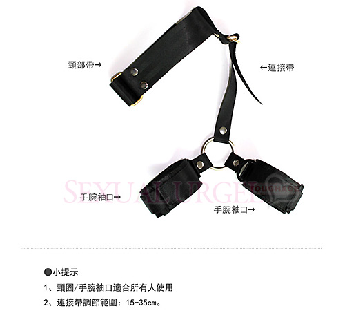 上體的捆縛充滿樂趣,方法也非常之多。這個款式將 雙手反綁在背後,高度可隨意調節。是一種非常嚴厲 的約束形式。