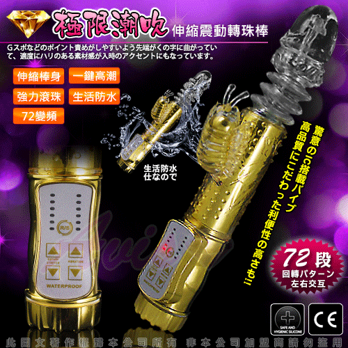 最新強力電動伸縮按摩棒,可同時震動陰道、陰核,震動力強勁!耐用、耐操,同時可震動,遠遠超越了男性陽具所能發揮的體能極限,強烈的戳幹力,幾乎讓人無法一手掌握,再怎麼強烈的燎原慾火,也會被它所撲滅夷平。中間的環紋部分不停地伸縮、抽動,在您的私處進出、摩擦;小蝴蝶的拍打、添吸著您最敏感的陰蒂……