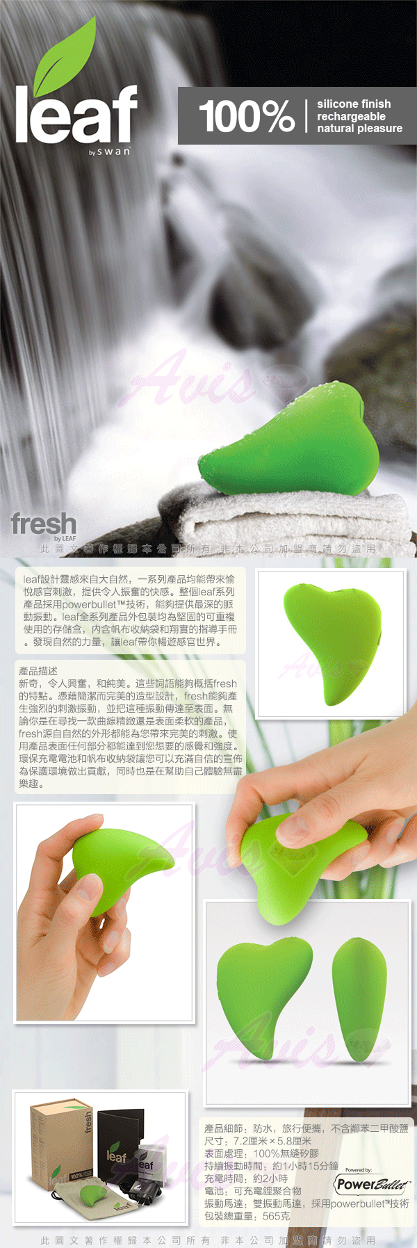 leaf設計靈感來自大自然,一系列產品均能帶來愉悅感官刺激,提供令人振奮的快感。整個leaf系列產品採用powerbullet™技術,能夠提供最深的脈動振動。leaf全系列產品外包裝均為堅固的可重複使用的存儲盒,內含帆布收納袋和翔實的指導手冊。發現自然的力量,讓leaf帶你暢遊感官世界。