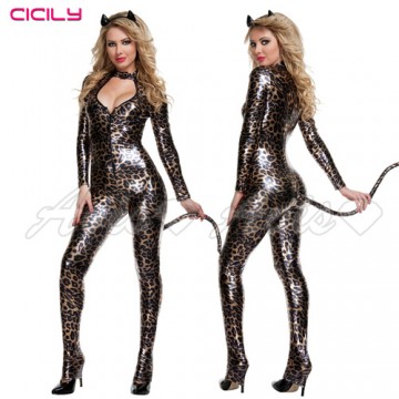 虐戀精品CICILY-豹紋印記-豹紋深V美胸塗膠仿皮 性感彈力連體 緊身膠衣
