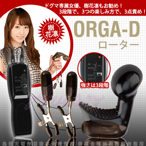 跳蛋、乳頭夾和2股間的自慰器組合。再來是可以將跳蛋輕鬆拆卸Dogma新開発的ORGA-D附加裝置。控制器有3段強弱可供選擇的優質商品。