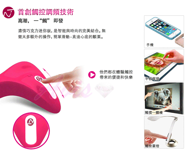 最新出品的專為愉悅女性而開發的流線型按摩震動器。其外形設計完全符合人體工程學原理,首創的觸摸式滑動條輕鬆操控震動強度,