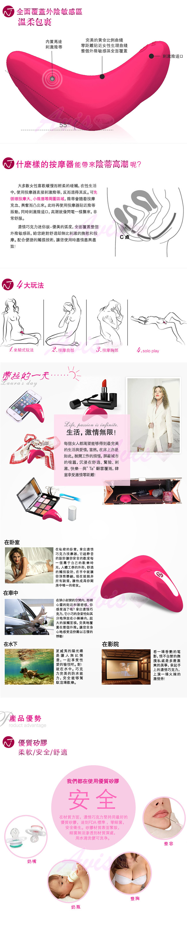 多段變頻變速功能,震力強勁,具有超靜音以及1米深防水的人性化設計。安全無毒的彈性體(彈性體)材質
