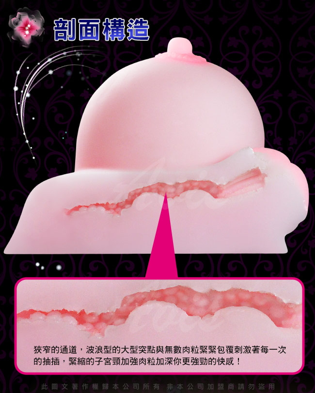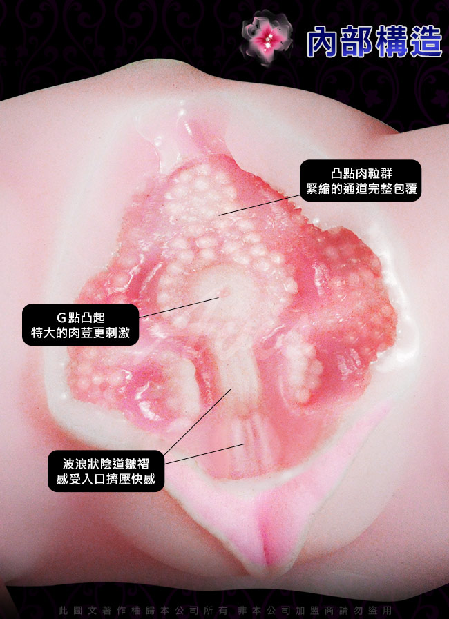 陰部完美內部構造超立體3D構造,真實再現女性內部構造,多層內壁包裹,高仿真肉感厚實發達的G點,無數皺褶構造和凸起結構,美臀極品當之無愧