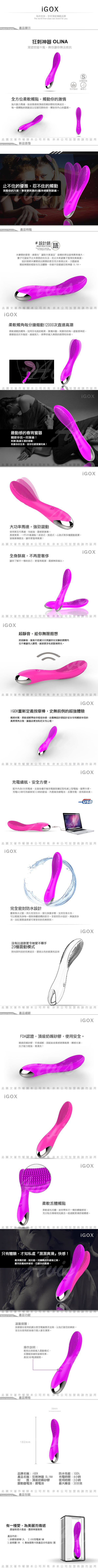 .主商品:香港IGOX OLINA 狂刺神器 20段變頻 G點 震動按摩棒 USB充電*1