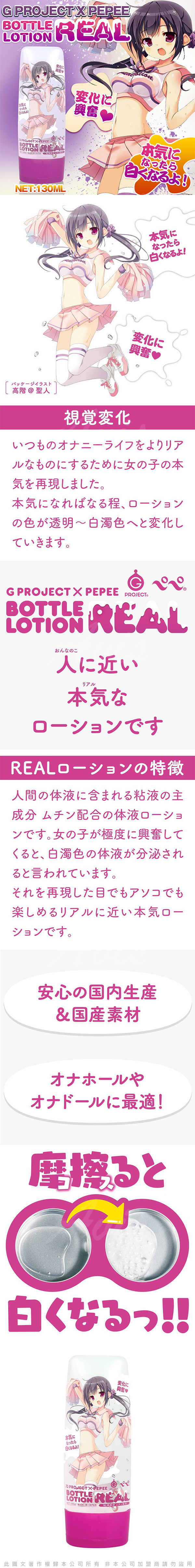【一使用透明色就變成白色!這種變化另人興奮】配合使用了含人體粘液成分的粘蛋白,是由人氣系列G-PROJCET與PEPE合作開發的第8彈!女生極度興奮後會產生白色液體,這款潤滑液就是白色液體的真實再現,親眼看到由透明~混白色自然變化成粘濕液。