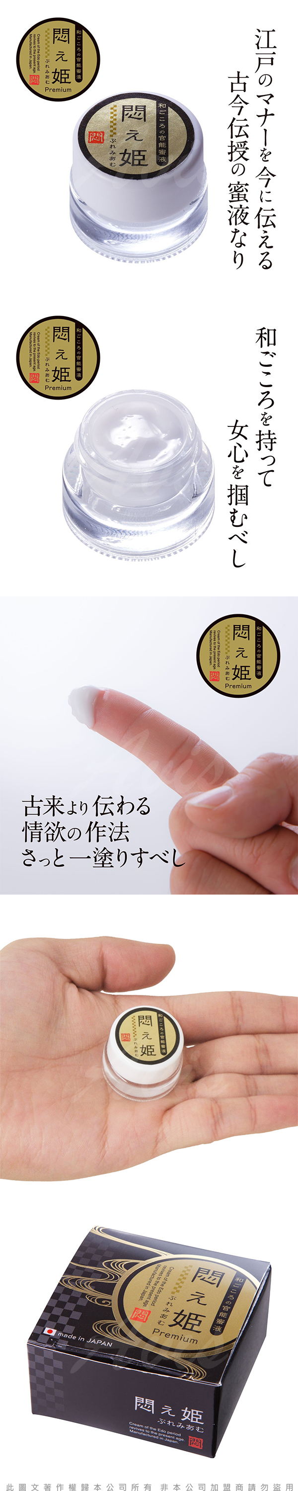 .商品內容:日本NPG 江戶禮儀 悶姬 PREMIUM 激情高潮 官能蜜液 情趣提升膏 5g