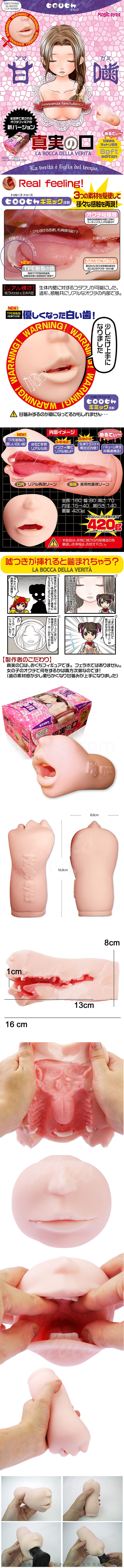 真實之口實屬經典中的經典,自推出後地位重未被動搖。Magic Eyes總集3年經驗再推出真實之口 (2代) 甘噛。2代實為真實之口嘅柔軟版,佢繼續「有牙」,並為求做出「甘噛(甜甜的輕咬)」,用上更柔軟的TPE物料去造「牙」。加上內裡超仿真設計,肥厚的舌頭及上齶紋,而且口腔內更柔較。配合非貫通設計亦帶來超越真人的真空吸感!不可不試!