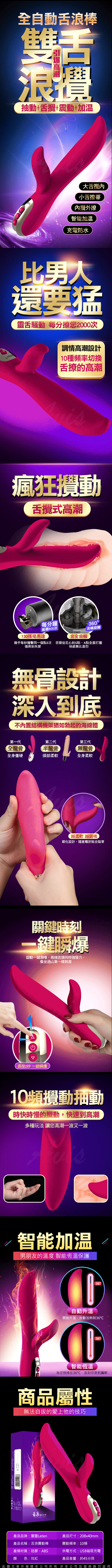 全自動雙舌浪動舔到您潮水決堤,不論是在觸感、溫度模仿真人舌頭,再增加真人沒有的搖擺、震動變頻功能,讓您浪起來分分鐘爽上天!內攪外震兩種口愛一起來,大舌深入撩盡每寸穴壁,小舌持續密集挑逗陰蒂陰唇內外同時刺激,爽到你浪噴!採用認證親膚矽膠,您可放心親近私處。並且擁有智能加溫功能熱辣辣的舌頭快速挑起你的慾火。