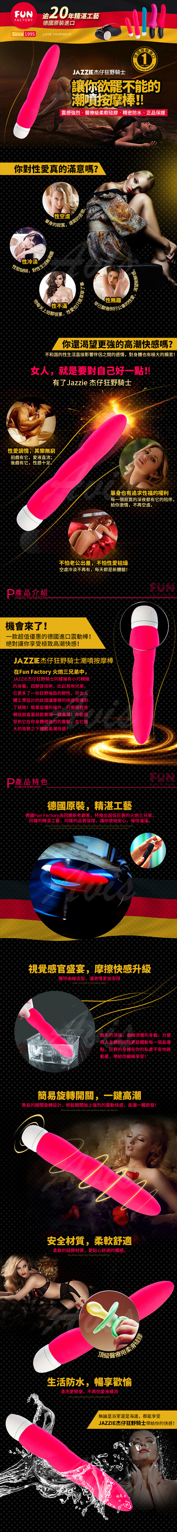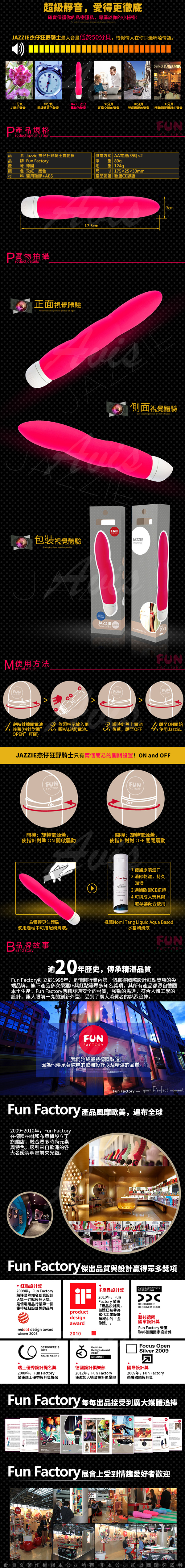 德國FUN FACTORY新出的小型按摩棒系列之一,Jazzie的體型細長,但震動力郤十分強大,棒身由醫療級矽膠製成,十分柔軟,特別的棒身設計,能重點按摩各個部位,非常適合新手使用。