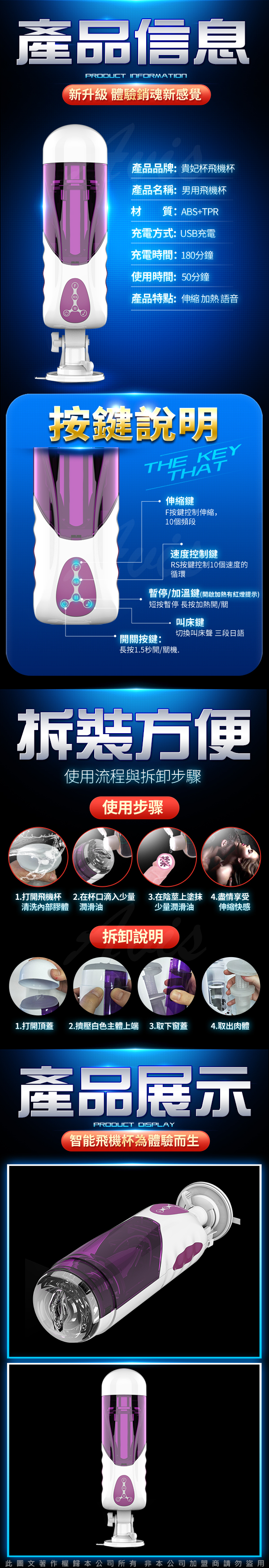 全自能伸縮智能貴妃杯全新體驗擁有10段自動伸縮活塞模式高速狂插讓您躺著享受讓她自己動爽到捨不得拔出來。搭配美女智能語音嫵媚嬌喘發音,如臨其境般淺吟呻吟讓您欲罷不能~貼心的智能加溫保持舒適溫度溫暖的包裹住您。並擁有強力吸盤讓您可以免手提多種角度隨時隨地任意玩,徹底解放您的雙手喔