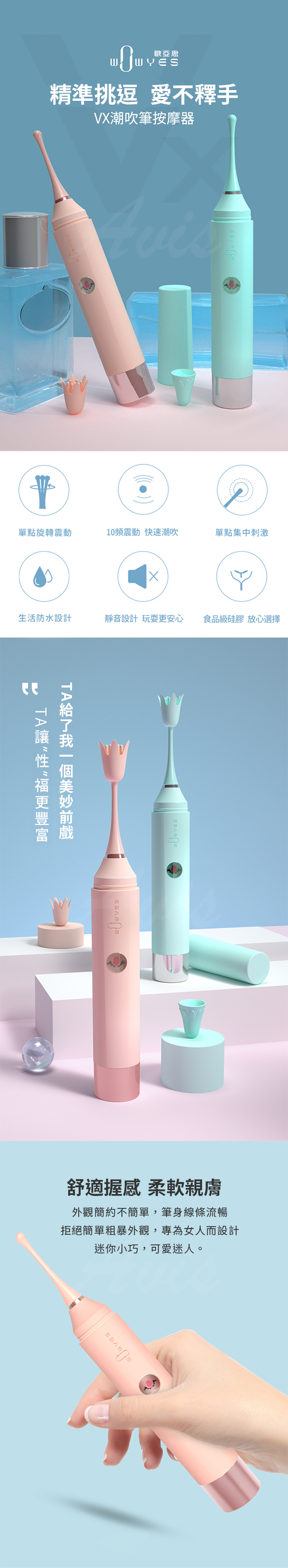 品名:WOWYES 阿瑪尼Vx 10段變頻震動磁吸充電潮吹震筆-粉