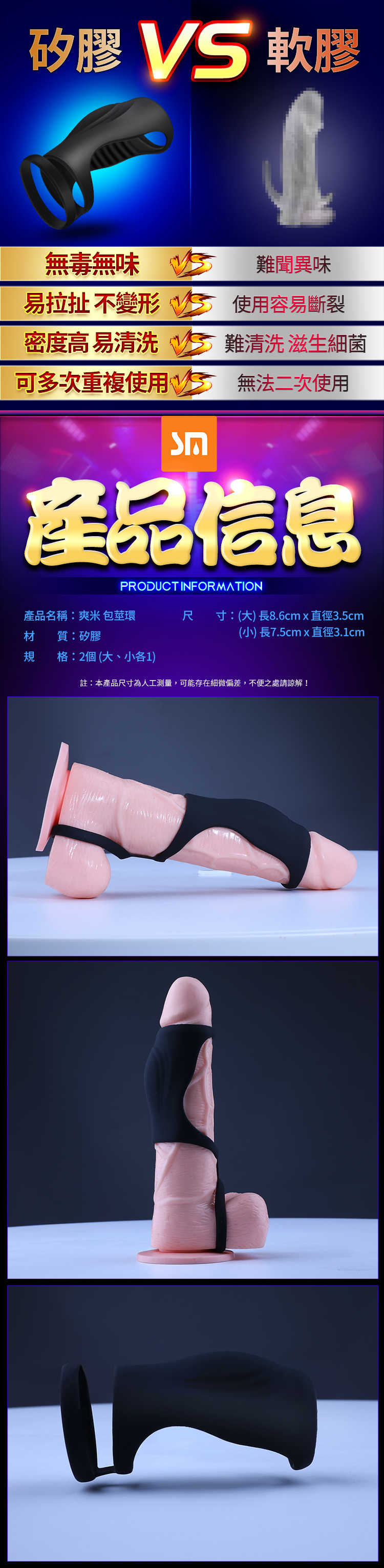 .商品內容:粗勇 三重鎖根矽膠鎖精環兩件組