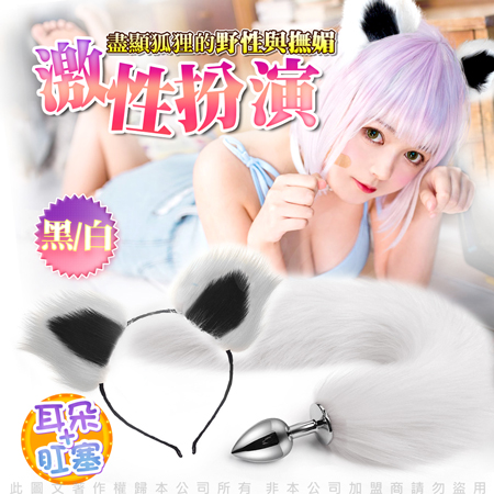 妖豔小狐狸角色扮演 毛絨耳朵+不鏽鋼肛塞尾巴 狐狸尾 白黑