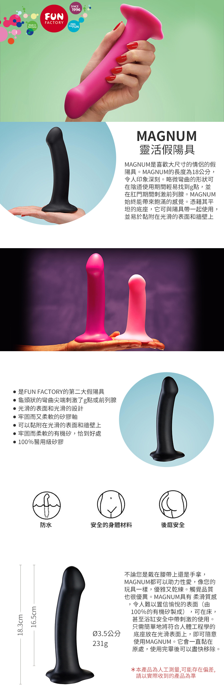 .主商品:德國Fun Factory Magnum 矽膠平頭吸盤按摩棒-黑