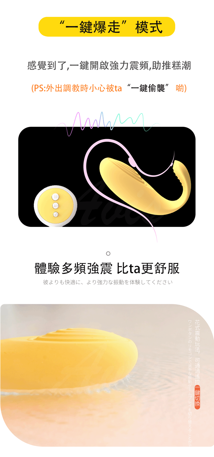 10種頻率不同玩法。跳蛋採U型彈性尾部溫柔貼合人體外肛/陰部線條,讓您可外出使用,搭配無線遙控讓您與愛人更加貼近喔