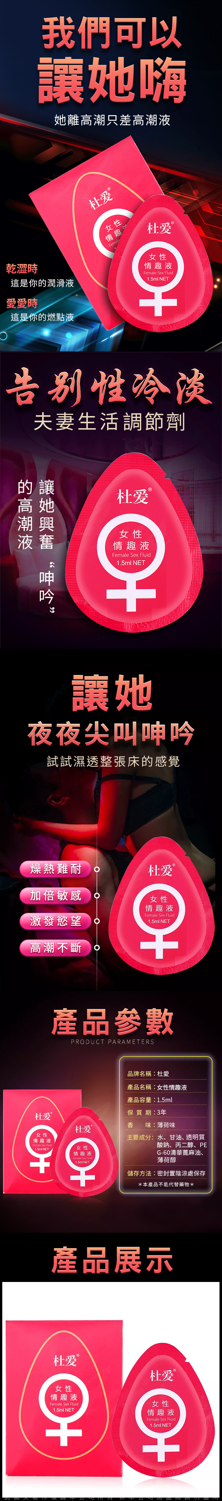 品牌名稱:杜愛產品名稱:女性情趣液產品容量:1.5ml保質期:3年香味:薄荷味主要成分:水、甘油、透明質酸鈉、丙二醇、PEG-60清華蓖麻油、薄荷醇