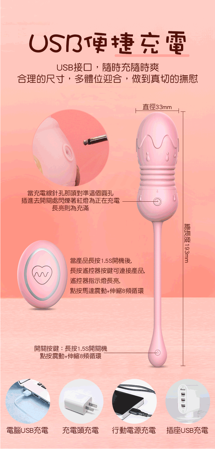 功能:8段伸縮變頻震動、生活防水、無線遙控