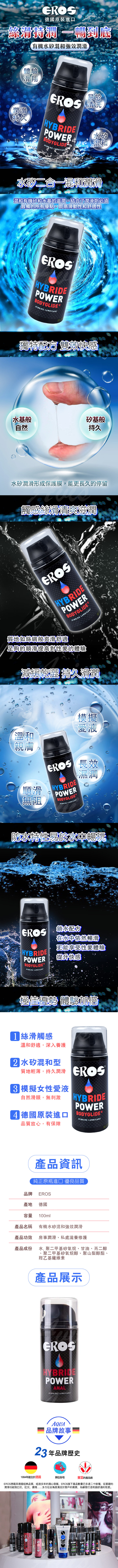 品牌:EROS產地:德國容量:100ml產品名稱 產品功效 房事潤滑、私處滋養修護產品成份 水,聚二甲基矽氧烷、甘油、丙二醇、聚二甲基矽氧烷醇、聚山梨醇酯、經乙基纖維素