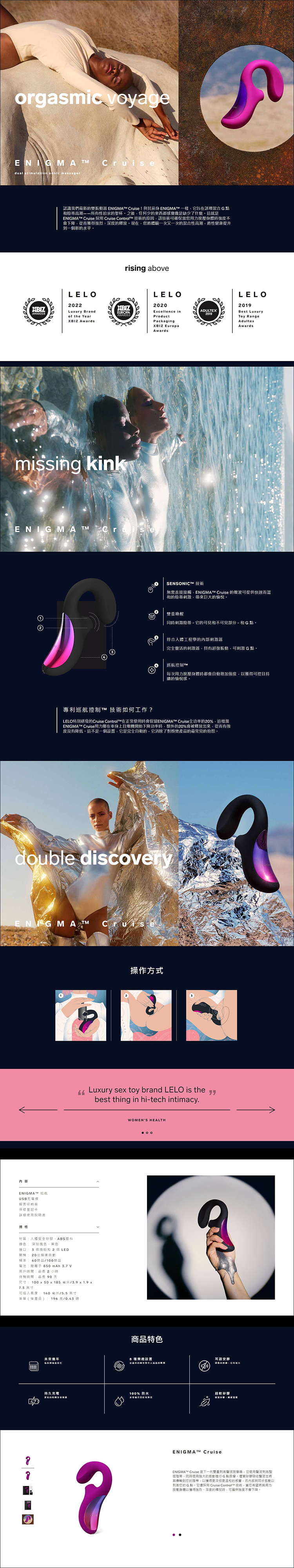 認識我們最新的雙振動器 ENIGMA™ Cruise!與其前身 ENIGMA™ 一樣,它旨在誘導混合 G 點和陰蒂高潮——所有性追求的聖杯。之後,任何少的東西都感覺像是缺少了什麼。這就是 ENIGMA™ Cruise 採用 Cruise Control™ 技術的原因,該技術可確保當您用力按壓身體時強度不會下降,從而獲得強烈、深度的釋放。現在,您將體驗一次又一次的混合性高潮,將性健康提升到一個新的水平。