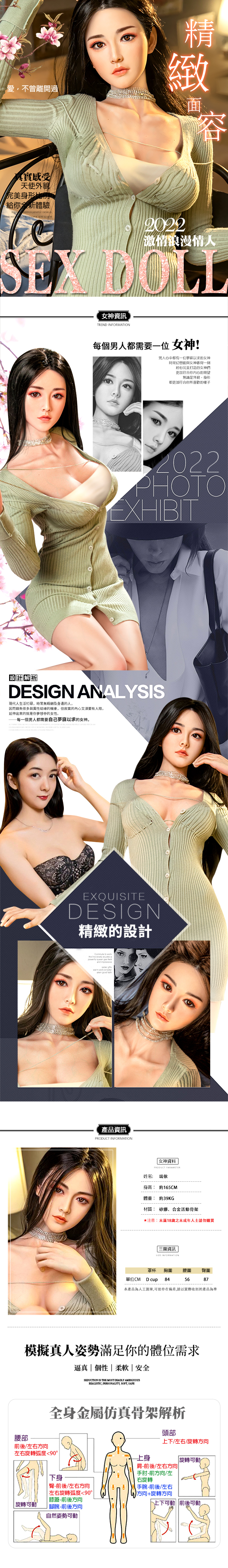 姓名:瑞依身高:約165CM體重:約39KG材質:矽膠、合金活動骨架*注意:未滿18歲之未成年人士請勿購買