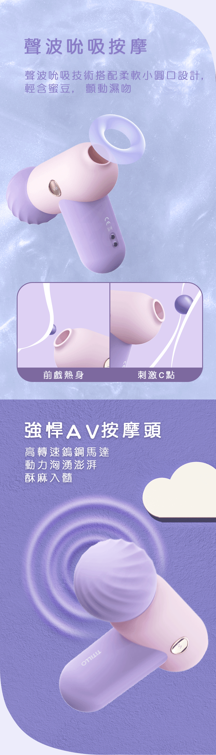 另一頭是聲波吮吸按摩,聲波吮吸技術搭配柔軟小圓口設計,輕含蜜豆,顫動濕吻,前戲熱身,刺激C點