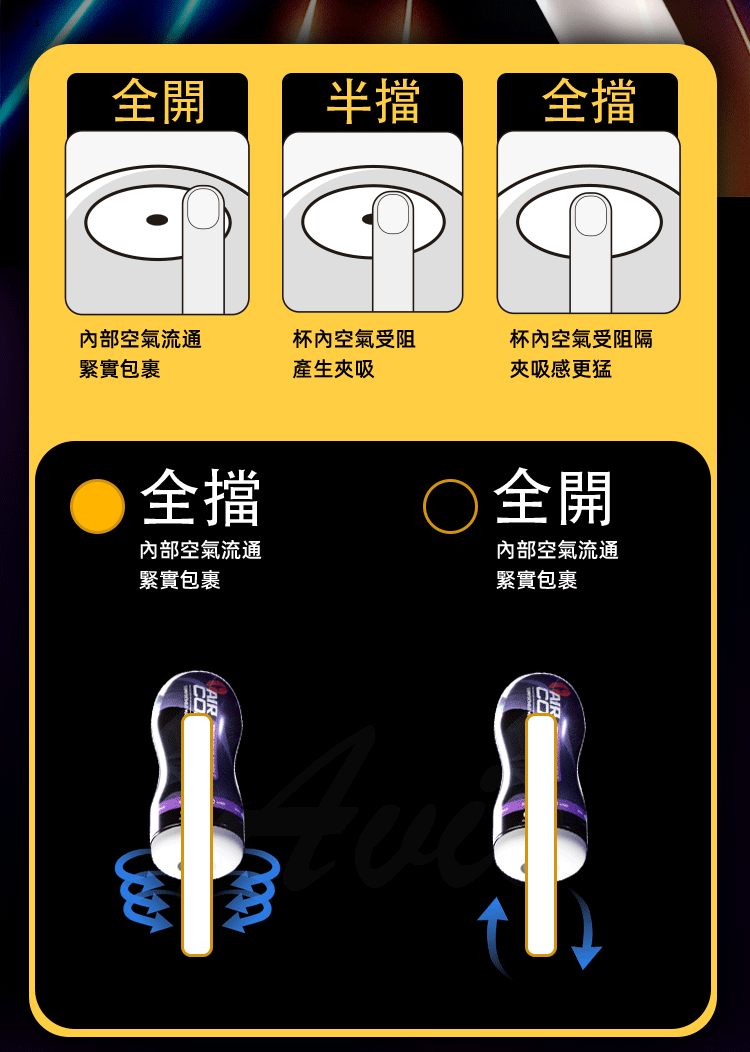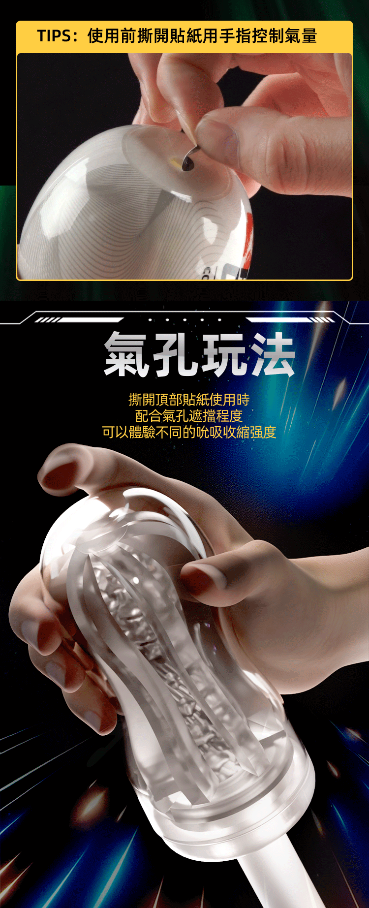 上方設有氣孔設計,進入時內膽和杯內空氣相互抵制,帶來緊致的阻尼感,精確模擬包裹夾縮的真實體驗。每次抽出瞬間,頂部氣孔吸入空氣產生反作用力,強化負壓吸吮感,呈現如同真人般的吮吸效果。