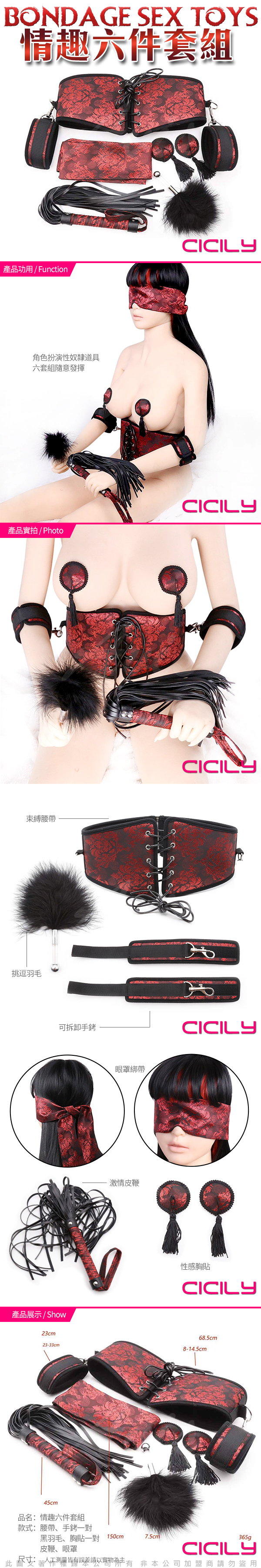 .商品內容:CICILY SM 中國風情趣 情趣六件組 乳貼/鞭子/羽毛/眼罩/束腰/手銬