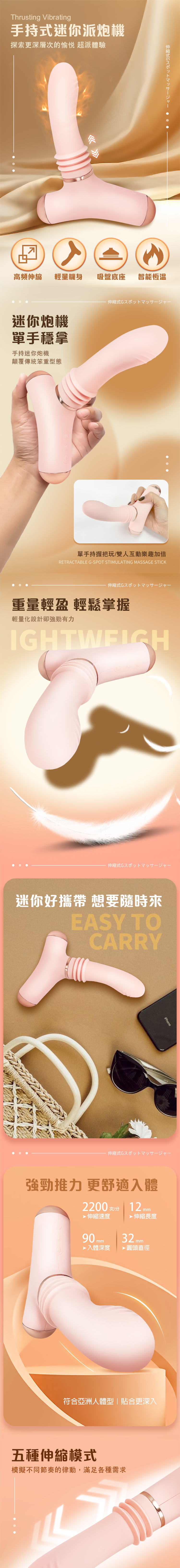 - 符合亞洲人體工學:專為亞洲女性設計,入體深度最高達9cm、直徑僅3.2cm,精準刺激G點與P點。